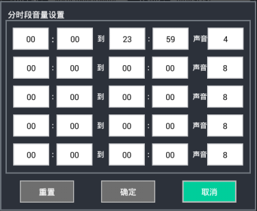 音量設(shè)置界面如下圖所示,最多可指定5個(gè)不同時(shí)段的音量,默認(rèn)情況下全天不分時(shí)段則只需要指定第一段00:00~23:59的音量值。