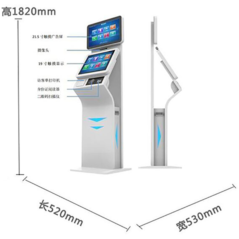 博奧智能雙屏訪客自助登記一體機(jī)外形美觀大方,結(jié)構(gòu)合理,外殼采用鈑金材質(zhì)烤漆工藝;集成21.5寸廣告屏和19寸用戶操作屏,身份證閱讀器,打印機(jī)等模塊,主要用于來訪人員進(jìn)出登記。