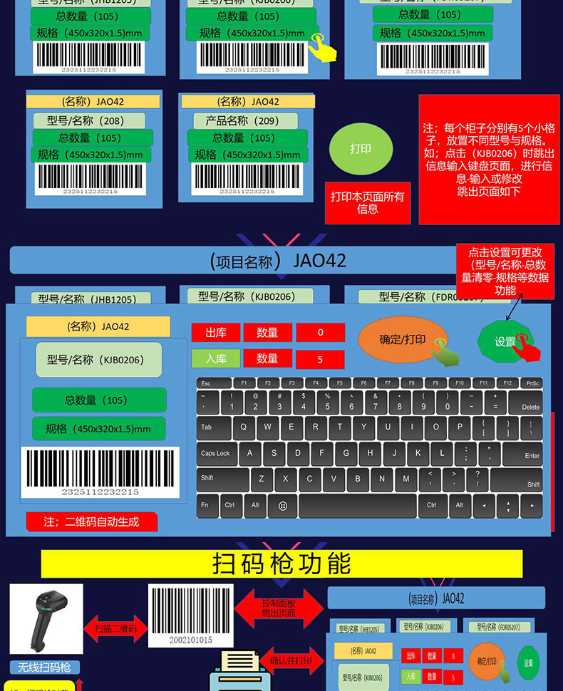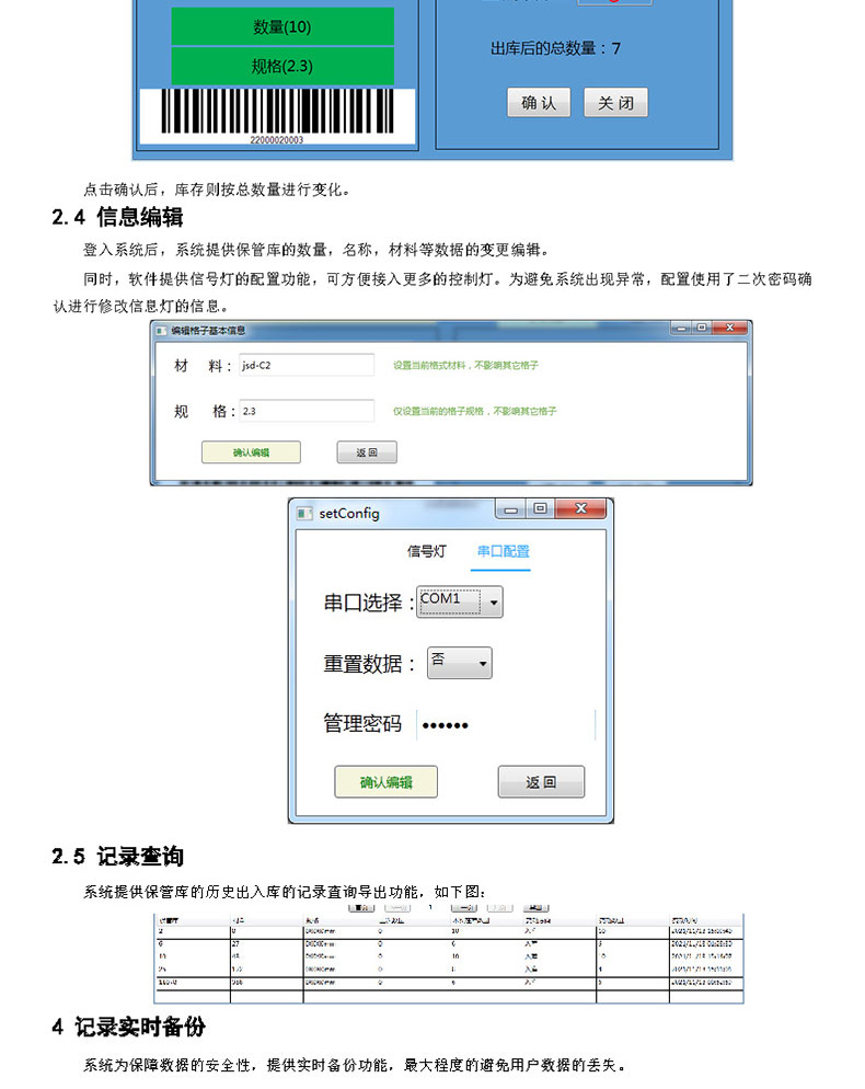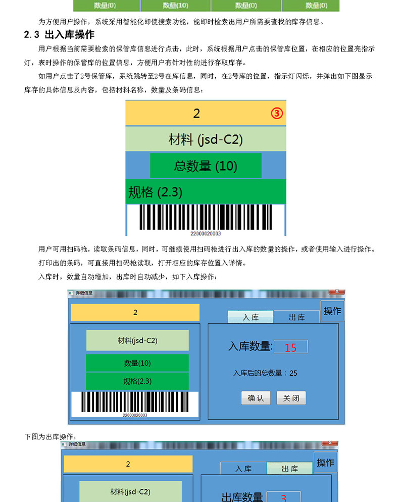 1、可通過掃碼槍,掃描條形碼,同時(shí)找到保管庫位置,并使指示燈閃爍,同時(shí),也可使用掃碼槍增減出入庫的數(shù)量信息。