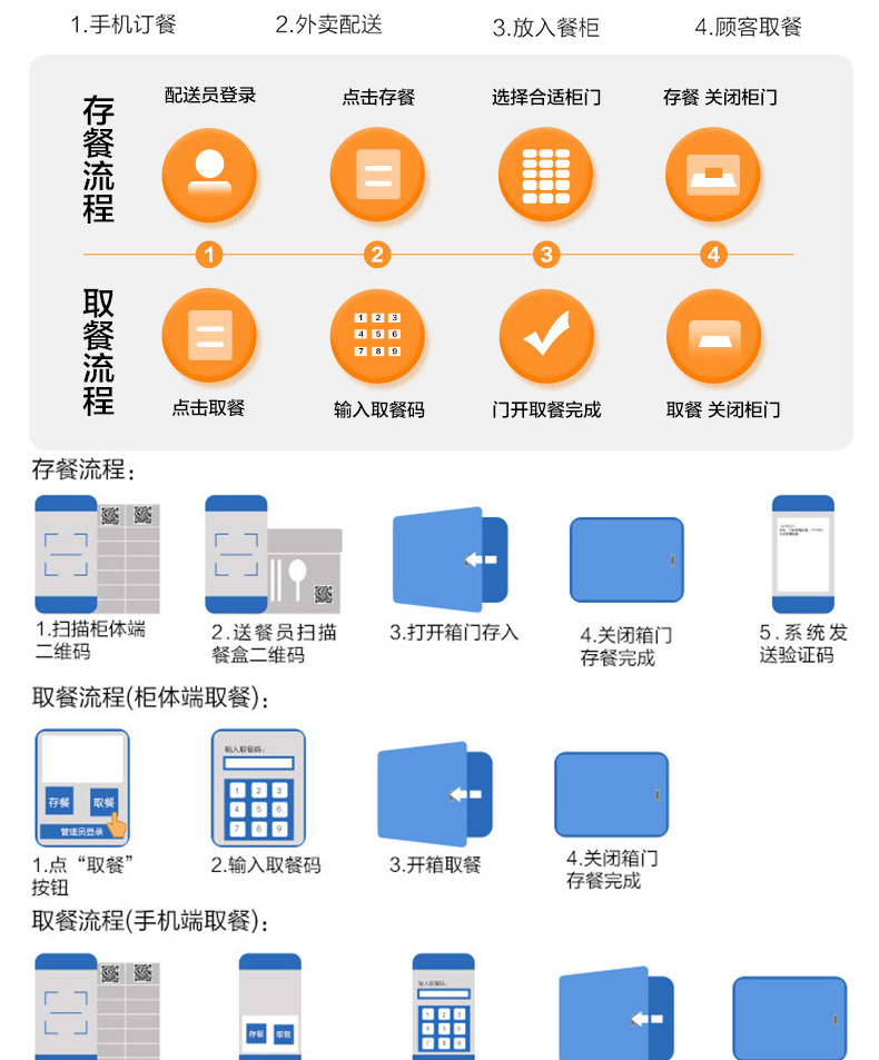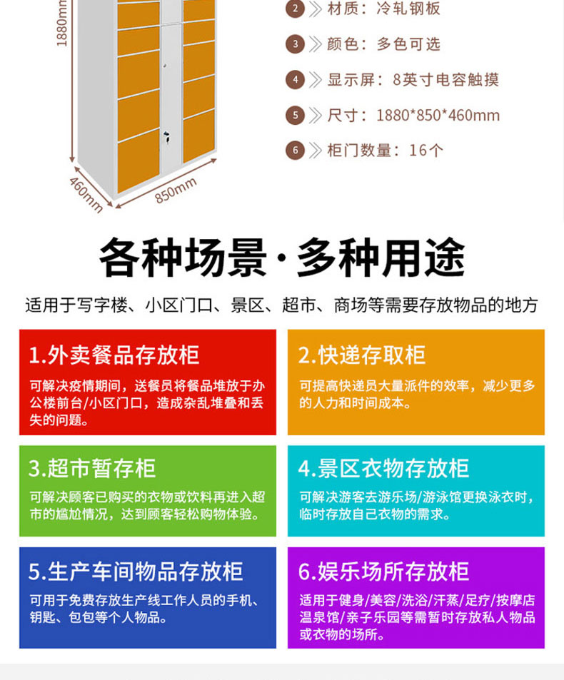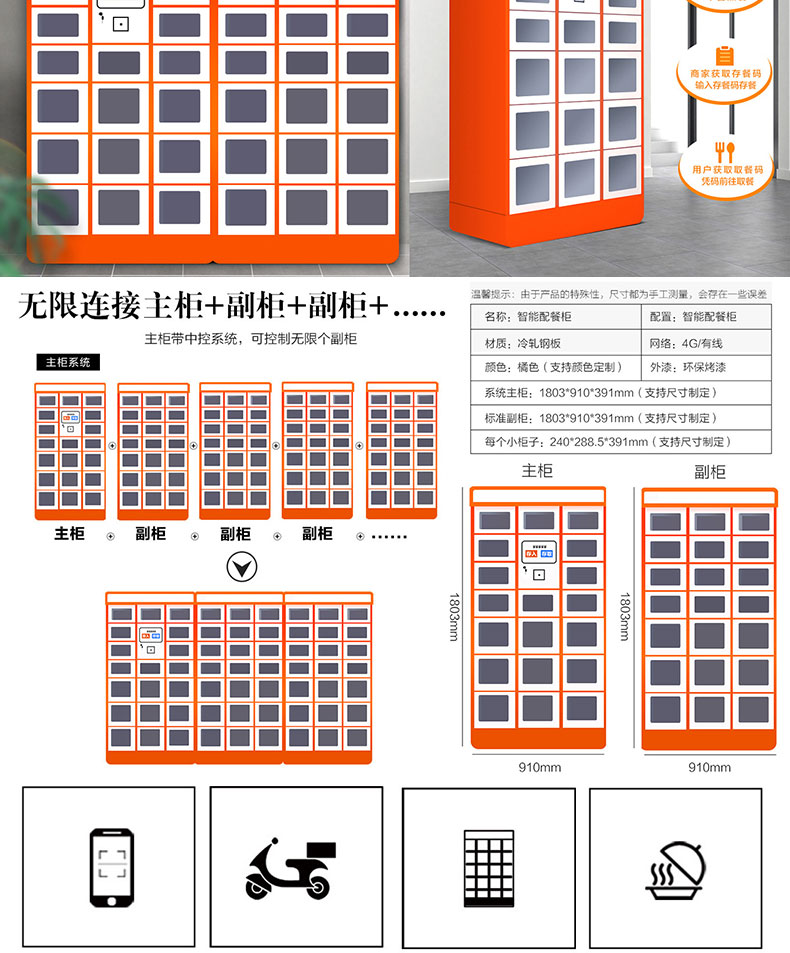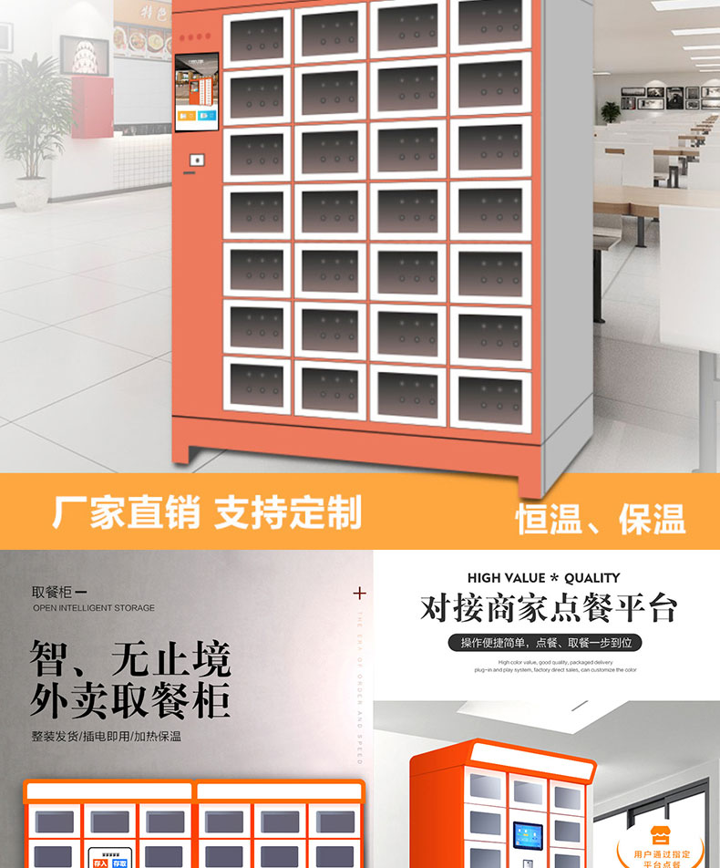 本產(chǎn)品應(yīng)用于外賣、團餐配送、自動售賣等場景,配送人員將餐放入柜中,顧客收到取餐提示,根據(jù)自己時間取餐。柜體可實現(xiàn)單獨獨立加熱保溫、消毒、照明等功能,不用擔心餐變涼及安全問題,解決配送,分餐配送、分餐困難、用戶體驗差得問題。