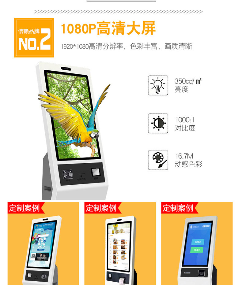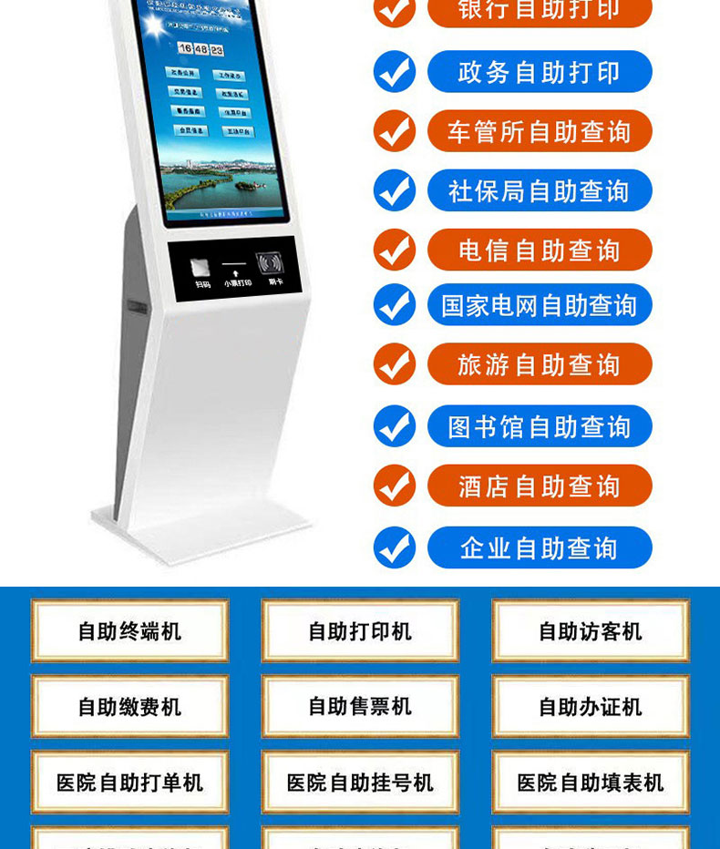 自助終端機(jī)定制:定制各種場景各種款式非標(biāo)終端機(jī);例如訪客機(jī)、景區(qū)自助取票機(jī)、醫(yī)院繳費(fèi)查詢機(jī)、醫(yī)院自助取單機(jī)、社保查詢機(jī)、室內(nèi)外廣告機(jī)、排隊(duì)叫號機(jī)、工控一體機(jī)、電力繳費(fèi)查詢機(jī)、圖書自助銷售機(jī)、便攜式計(jì)算機(jī)、酒店自助入住機(jī)、自助收銀機(jī)等終端。