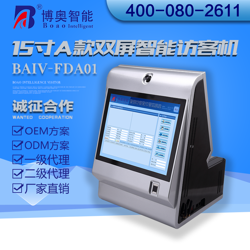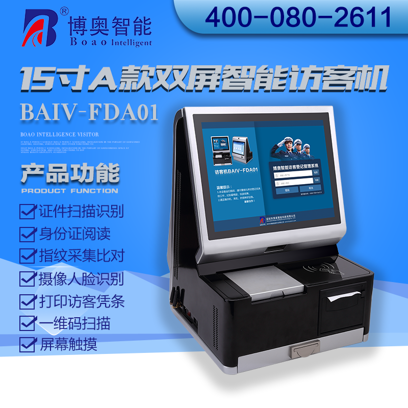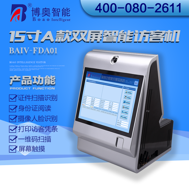? ? ? 15寸A款雙屏智能訪客機(jī)利用用計(jì)算機(jī)、觸摸屏手寫(xiě)、證件識(shí)別(OCR),射頻識(shí)別、指紋生物識(shí)別、熱敏打印、條碼、數(shù)碼攝像、自動(dòng)制證、硬件加密、網(wǎng)絡(luò)等技術(shù)實(shí)現(xiàn)智能信息化訪客登記管理,將目前手工填寫(xiě)出入登記管理、電話咨詢被訪人等傳統(tǒng)方式轉(zhuǎn)變?yōu)楦呖萍嫉挠?jì)算機(jī)化、信息數(shù)字化處理,消除了手寫(xiě)登記填寫(xiě)時(shí)間長(zhǎng),容易出錯(cuò),信息缺失虛假多,不易保存,信息查詢困難等種種弊端;訪客登記管理系統(tǒng)能夠準(zhǔn)確快速的對(duì)來(lái)訪人員的證件、圖像、指紋等信息進(jìn)行識(shí)別登記并保存,以便日后查詢,同時(shí)利用聯(lián)動(dòng)功能,可以對(duì)進(jìn)出車輛自動(dòng)識(shí)別登記。