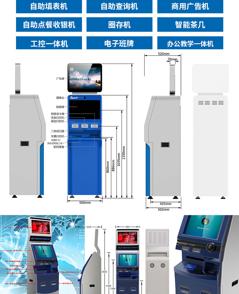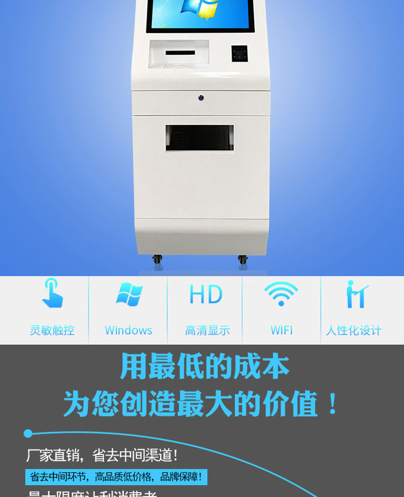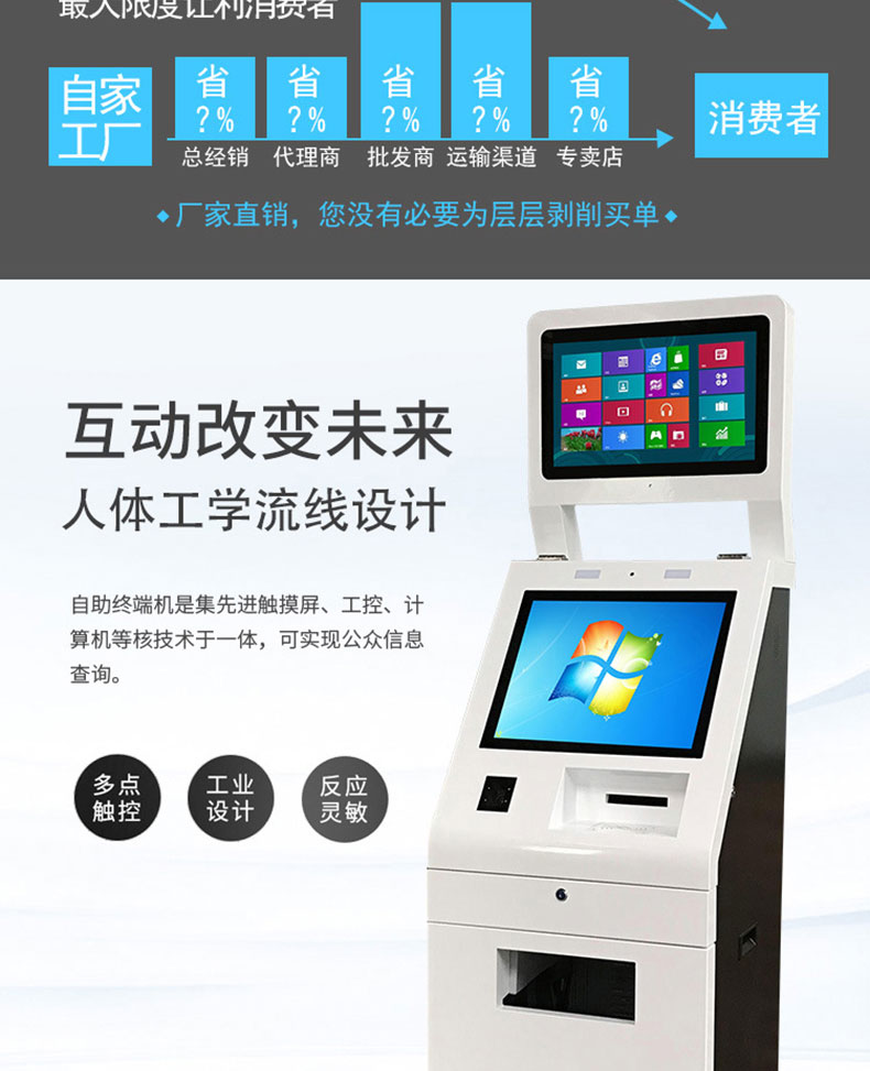定制實用的自助終端設備,我們是專業(yè)。多種定制款式任意選擇,可根據(jù)需求定制外觀屏幕尺寸可選,配件數(shù)量可選,主機配置可選。