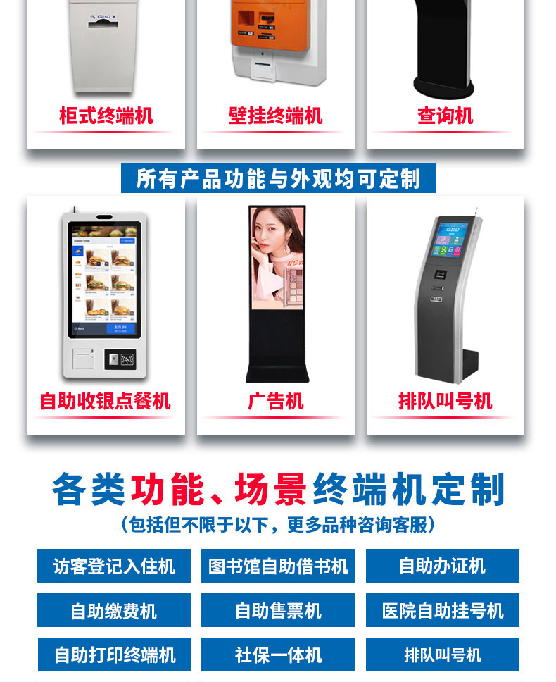 定制實用的自助終端設(shè)備,我們是專業(yè)。多種定制款式任意選擇,可根據(jù)需求定制外觀屏幕尺寸可選,配件數(shù)量可選,主機配置可選。