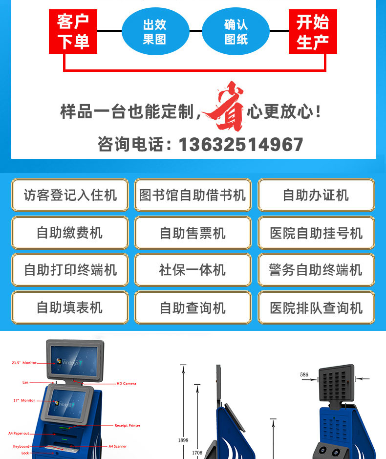 自助終端機(jī)定制:定制各種場(chǎng)景各種款式非標(biāo)終端機(jī);例如訪客機(jī)、景區(qū)自助取票機(jī)、醫(yī)院繳費(fèi)查詢機(jī)、醫(yī)院自助取單機(jī)、社保查詢機(jī)、室內(nèi)外廣告機(jī)、排隊(duì)叫號(hào)機(jī)、工控一體機(jī)、電力繳費(fèi)查詢機(jī)、圖書自助銷售機(jī)、便攜式計(jì)算機(jī)、酒店自助入住機(jī)、自助收銀機(jī)等終端。