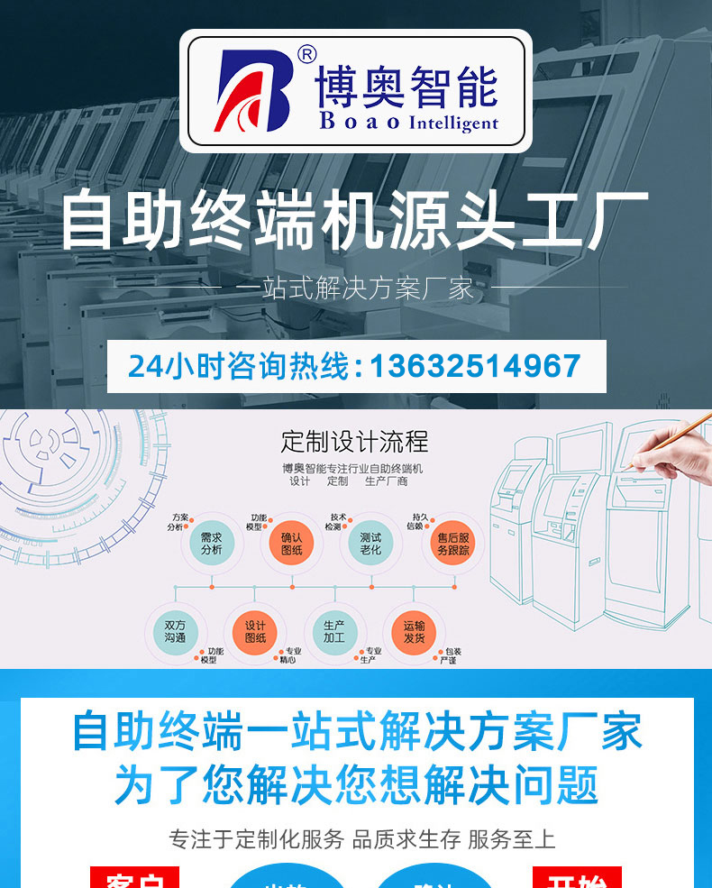 深圳市博奧智能科技有限公司專業(yè)提供自助終端機(jī)、觸摸查詢一體機(jī)、廣告機(jī)、液晶顯示器等產(chǎn)品的硬件、軟件研發(fā)與設(shè)計(jì)加工OEM/ODM等一站式服務(wù);我們一直秉承以產(chǎn)品質(zhì)量為核心、客戶至上、服務(wù)共贏為宗旨,為金融、醫(yī)療、教育、人工智能、政府工程項(xiàng)目、智慧城市、軌道交通、商業(yè)自助服務(wù)、廣告?zhèn)髅降刃袠I(yè)提供質(zhì)量過(guò)硬的產(chǎn)品和優(yōu)質(zhì)的服務(wù)。