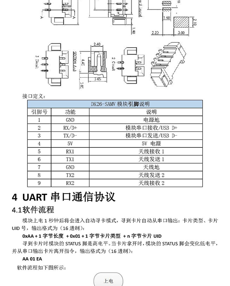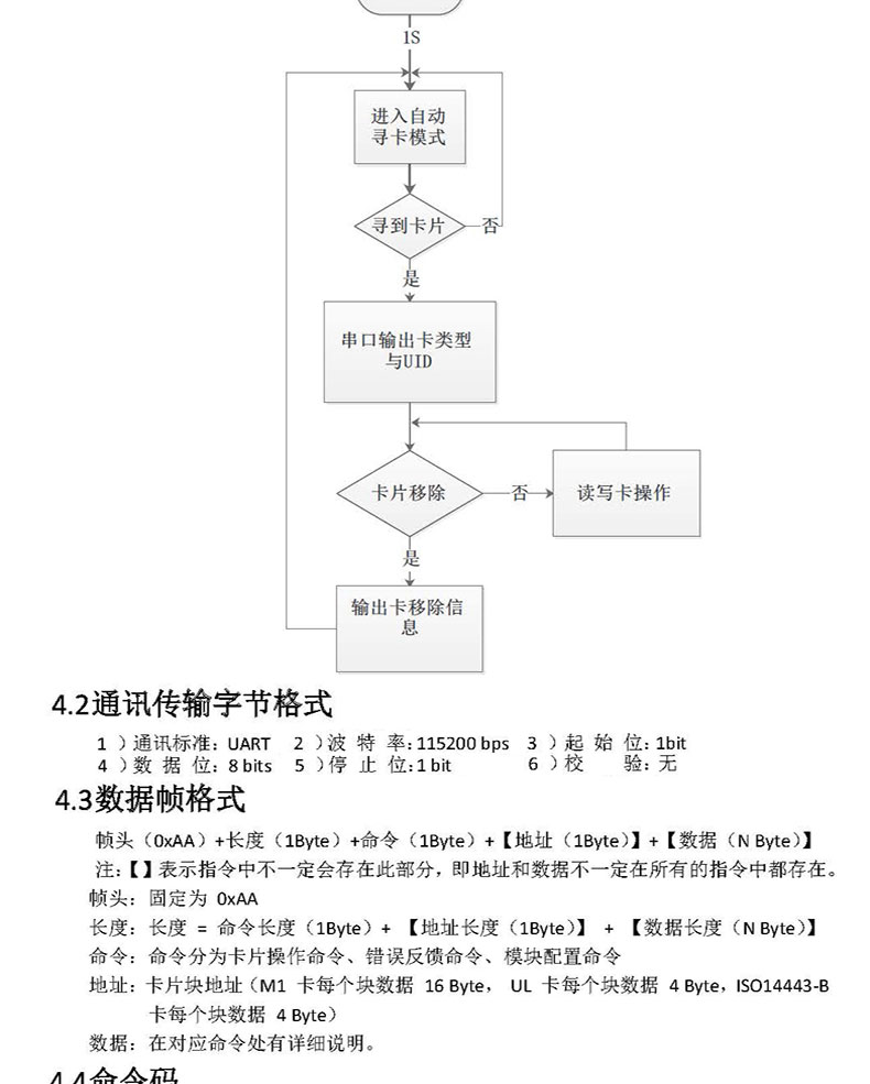 模塊采用 UART 通訊接口(可選 USB),兼容性好,通用性強(qiáng)。用戶通過 UART 向模塊發(fā)送簡單指令可實現(xiàn)對卡片進(jìn)行讀/寫操作,簡單易用,用戶可使用該模塊高效快速開發(fā)高頻讀寫功能產(chǎn)品。