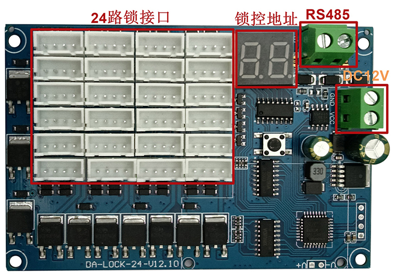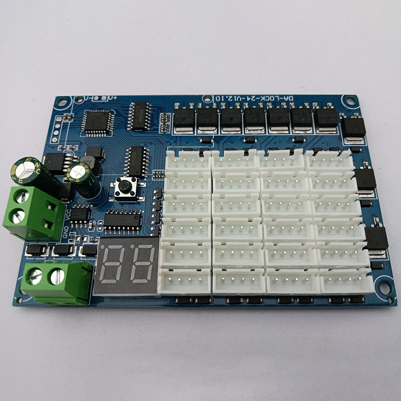 24路鎖控板又名為電子鎖控制模塊,主要用來控制各類格子柜門電子鎖的開與關(guān),板子集成24路鎖控杜邦接口,485通信接口,DC電源接口,鎖控地址顯示模塊,一鍵全開功能!板子通過485通信協(xié)議,實(shí)現(xiàn)電腦串口助手發(fā)送數(shù)據(jù)開鎖和獲取箱門狀態(tài)反饋!