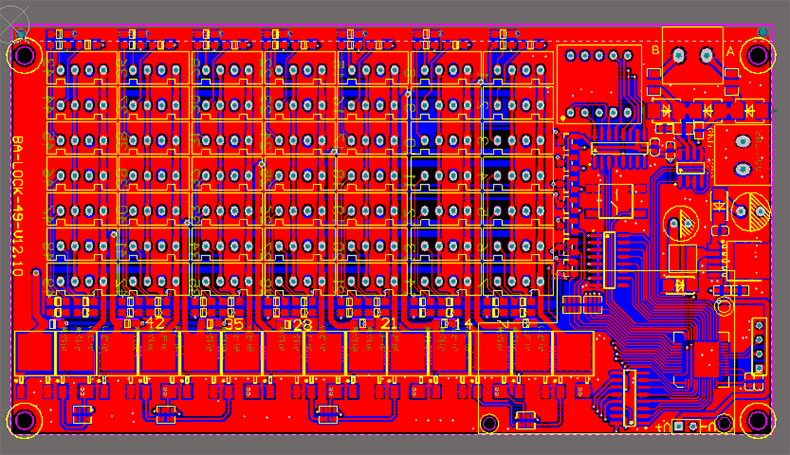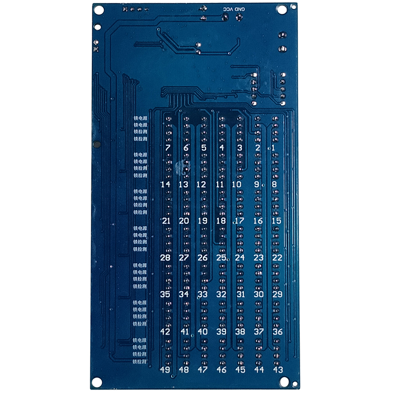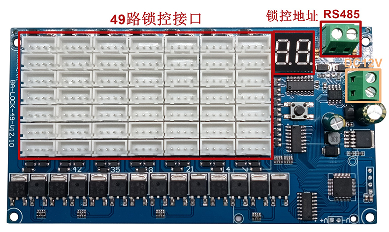49路鎖控板又名為電子鎖控制模塊,主要用來控制各類格子柜門電子鎖的開與關(guān),板子集成49路鎖控杜邦接口,485通信接口,DC電源接口,鎖控地址顯示模塊,一鍵全開功能!板子通過485通信協(xié)議,實(shí)現(xiàn)電腦串口助手發(fā)送數(shù)據(jù)開鎖和獲取箱門狀態(tài)反饋!
