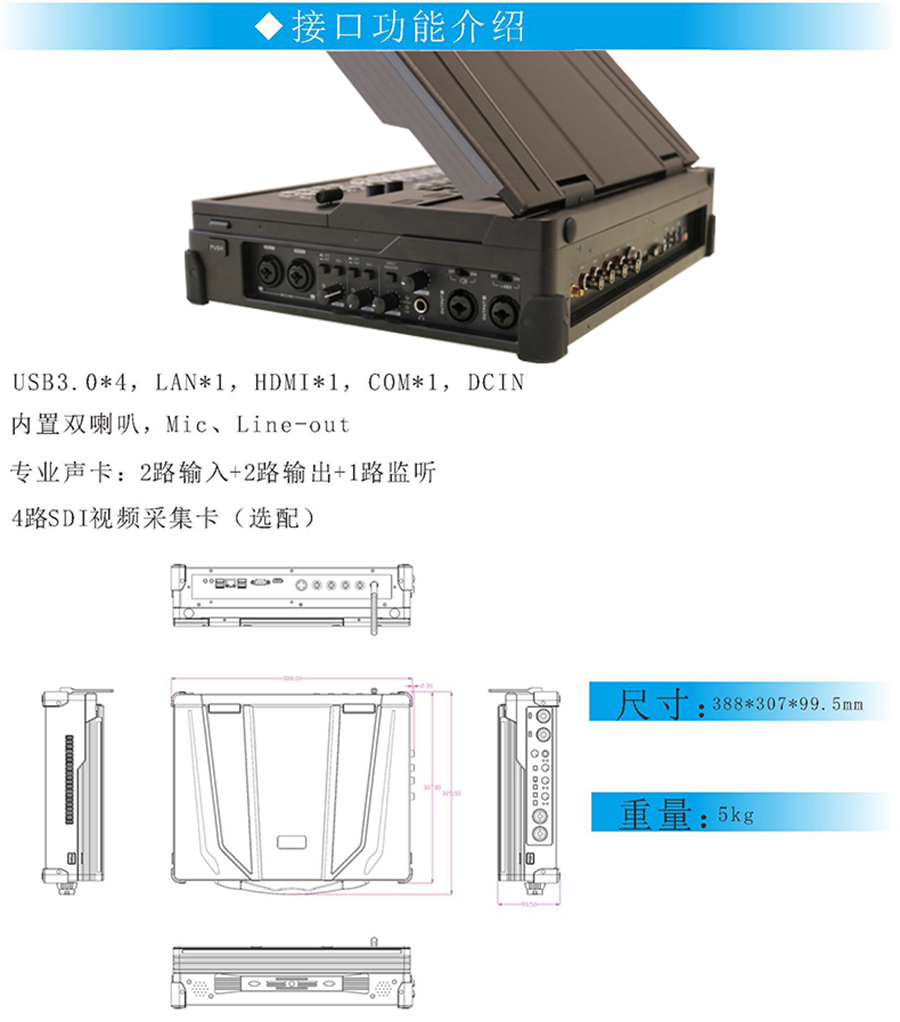 便攜式工控筆記本計算機(jī)鋁鎂合金外殼CNC一體成型,外觀精美,重量輕,方便攜帶;結(jié)構(gòu)設(shè)計合理,達(dá)到工業(yè)級標(biāo)準(zhǔn),具有防振防塵等特點,為客戶量身定制產(chǎn)品,集成15.6高清屏,Intel 6核高性能處理器,內(nèi)置視頻采集卡、專業(yè)聲卡、專業(yè)導(dǎo)播鍵盤;產(chǎn)品應(yīng)用于廣電行業(yè)和教育行業(yè)的入門級導(dǎo)播/直播,同時根據(jù)需求為您提供外觀功能設(shè)計定制服務(wù)