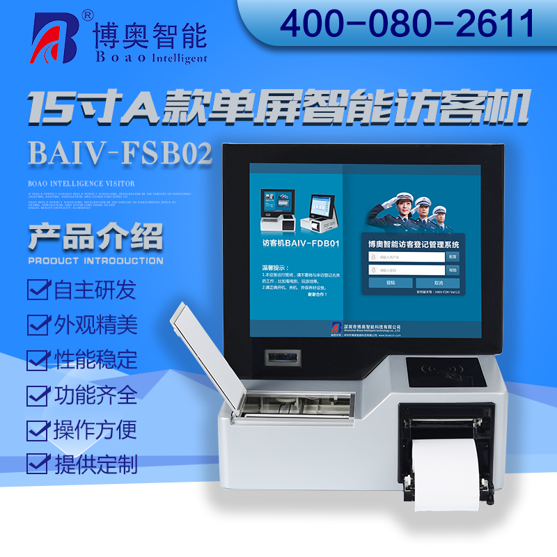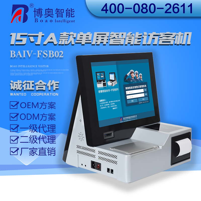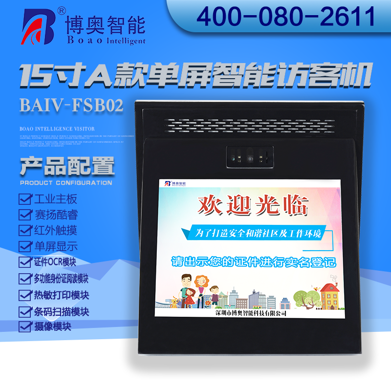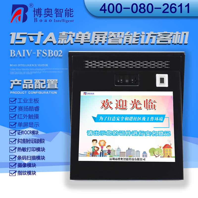 ? ? ? 15寸B款單屏智能訪客機(jī)是博奧智能自主開發(fā),采用人體工程學(xué)與模塊化設(shè)計(jì)相結(jié)合,融合計(jì)算機(jī)、觸摸屏手寫、證件識(shí)別(OCR),射頻識(shí)別、指紋生物識(shí)別、熱敏打印、條碼、數(shù)碼攝像、自動(dòng)制證、硬件加密、網(wǎng)絡(luò)等技術(shù);選用鈑金材料、表面噴粉工藝加工出來的一款訪客管理終端,訪客管理終端內(nèi)部裝有WIN7操作系統(tǒng)SQL Server數(shù)據(jù)庫(kù)及我公司自主開發(fā)的訪客登記管理軟件等主要軟件,從而匯集成了一套完善的智能訪客登記管理系統(tǒng),它具有外觀精美,功能完善,操作方便等特點(diǎn)。