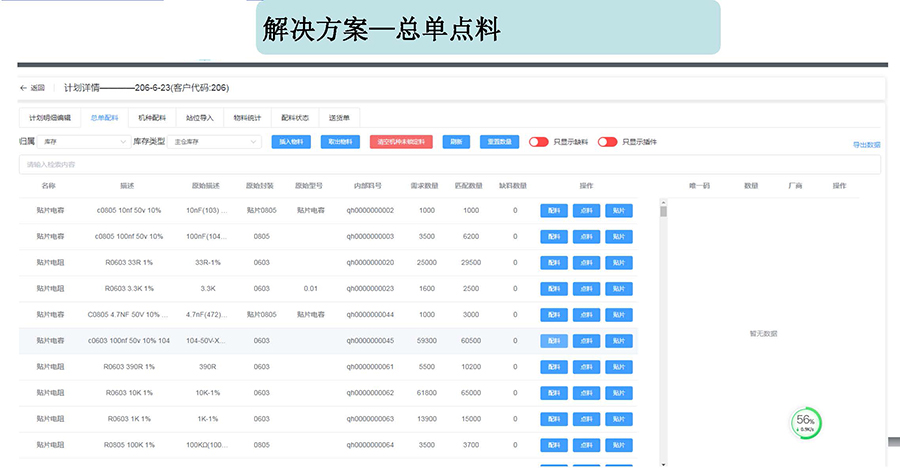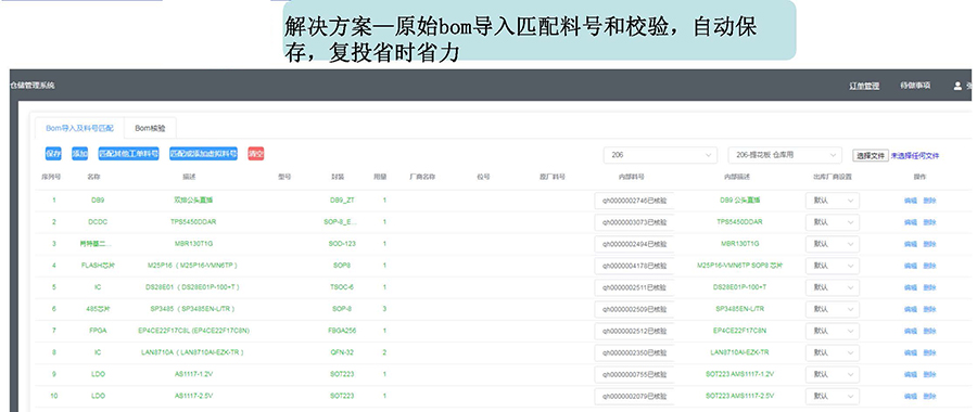 2.導(dǎo)入BOM,自動(dòng)匹配料號(hào),人工批量料號(hào),復(fù)核料號(hào)。