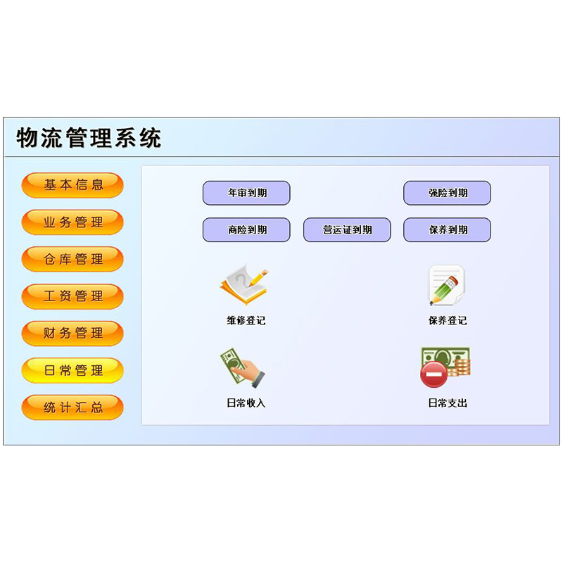 日常管理:系統(tǒng)提供了年審到期、強(qiáng)險(xiǎn)到期、商險(xiǎn)到期、營運(yùn)證到期、保養(yǎng)到期、維修登記和日常收入支出等管理功能。這些功能有助于公司合理安排各項(xiàng)日常事務(wù),確保業(yè)務(wù)正常運(yùn)行。